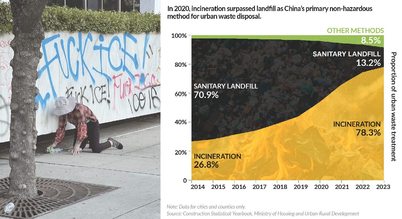 Confronted with a deluge of garbage, China initially followed the classic eco-playbook of “reduce, reuse, recycle.” It installed recycling bins, invested in public education campaigns, and pressured the delivery industry to cut down on excessive packaging, with some attempts at reuse along the way. But as consumption surged—driven especially by e-commerce and the booming food-delivery sector—the traditional approach could no longer keep pace. Instead of relying solely on upstream reduction or meticulous household sorting, Chinese authorities increasingly turned to technology and large-scale infrastructure to tackle the problem. Over the past decade, the country has built an extensive network of waste-to-energy incineration plants, making them a central pillar of its waste-management strategy.