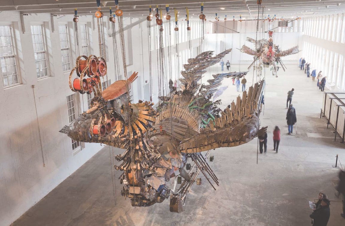 In Chinese contemporary art, trash and discarded objects have become potent symbols to critique consumer society and to reconnect with memories of a leaner past. Take for example Xu Bing’s “Phoenix” – two monumental bird sculptures, each nearly 30 meters long, that were crafted entirely from construction site waste. Xu, a renowned Chinese artist, collected steel rebar, shattered concrete, rusted tools, hard hats and other cast-off materials from Beijing building projects and assembled them into a pair of mythical phoenixes. Originally commissioned to hang in the atrium of a glitzy new skyscraper, Phoenix carried an unintended message – one that made the building’s developers uneasy. The birds are beautiful, yet born from rubble, implicitly asking: At what cost comes this shiny new city? Who toils amid the scraps? By glorifying garbage into art, Xu Bing turned the narrative of waste on its head: the trash of urbanization literally became the embodiment of China’s soaring aspirations.