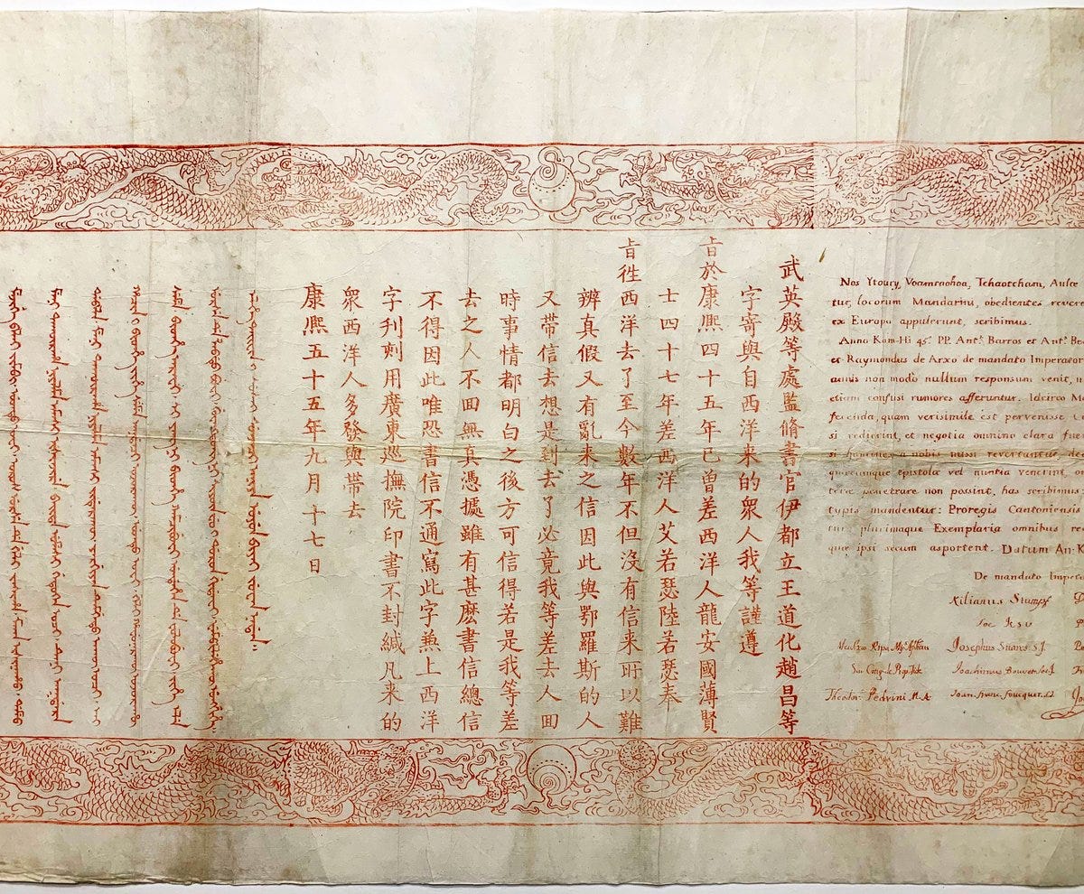 Frustrated and suspicious, the emperor took a dramatic step. On October 30, 1716 (Kangxi 55th year, 9th month, 17th day), he issued an extraordinary proclamation. Known in English scholarship as the “Red Manifesto,” this open letter was printed in Chinese, Manchu, and Latin. It was addressed “to all men from the West” and distributed at ports such as Guangzhou, intended for any Westerner entering China to take back to Europe, looking for his ‘Missing Imperial Envoy’.