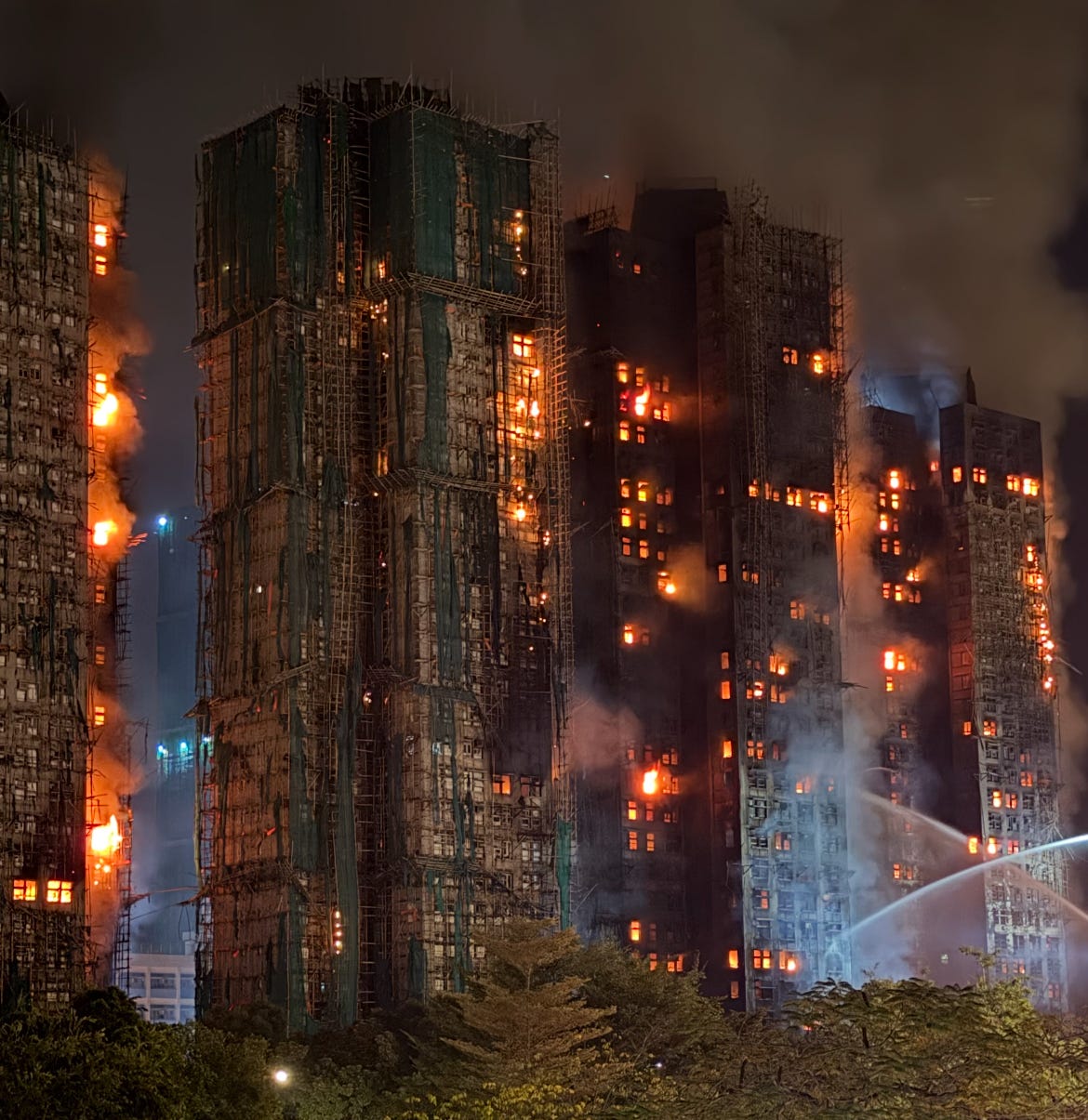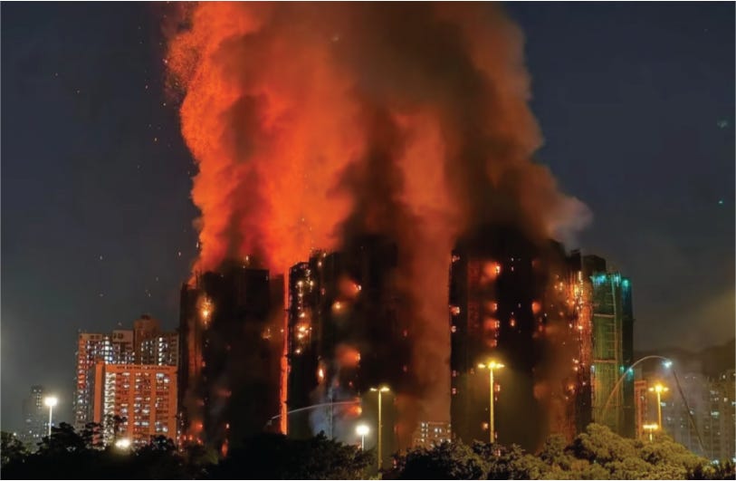 On November 26th, a dry, windy afternoon, smoke began to pour off the façade of Wang Fuk Court (宏福苑), a government-subsidised housing estate in Tai Po (大埔), in Hong Kong’s New Territories. The estate is under major renovation. Within an hour, flames were racing up and across the exterior of several 31-storey towers. Residents watched from an overpass as the fire seemed to run outside the buildings, devouring the bamboo scaffolding and green safety netting that wrapped the estate like a second skin.