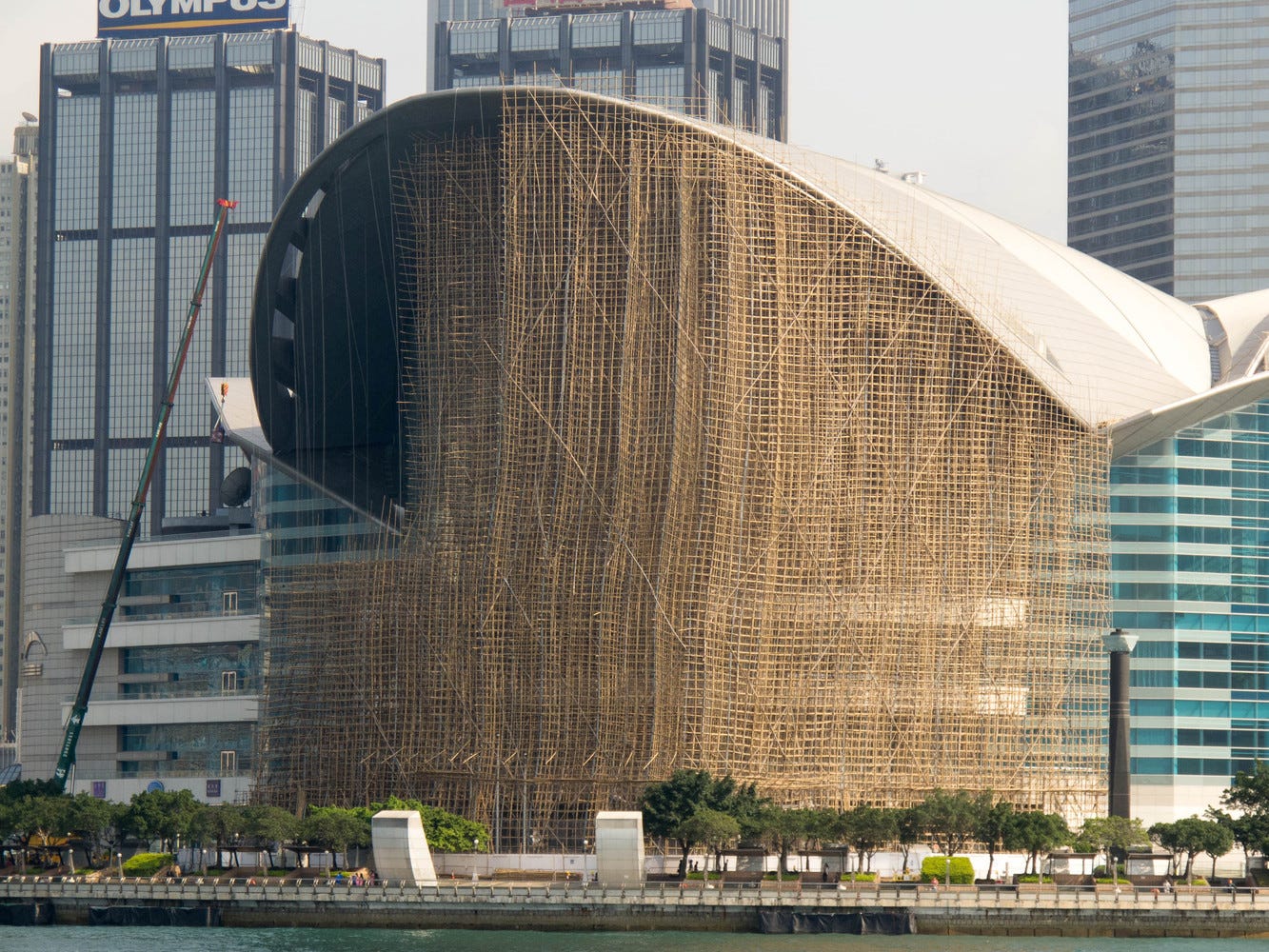 Bamboo scaffolding took off in the mid-20th century because it was cheap, light, flexible, and quick to erect in tight urban sites. Skilled scaffolders can wrap an entire tower, 40, 50 storeys, in a dense lattice tied with plastic strips, then cover it in netting to catch debris. A forest of bamboo poles on the skyline is so common that many travel guides now treat it as part of the city’s visual identity.1