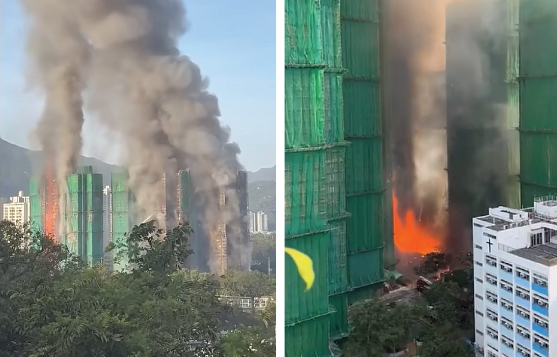 In Wang Fuk Court, several blocks were covered in bamboo scaffolding at the same time. The result was not just one building with a flammable wrapper, but a linked system of wrappers around an entire community.