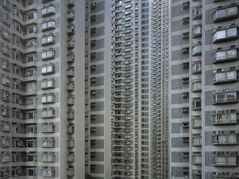 The city is one of the densest urban areas in the world, squeezed between mountains and sea and politically constrained land supply. Much of its working and middle class lives in public rental estates or subsidised ownership schemes like Wang Fuk Court, built in standardised blocks with small flats, here roughly 430–480 square feet each.